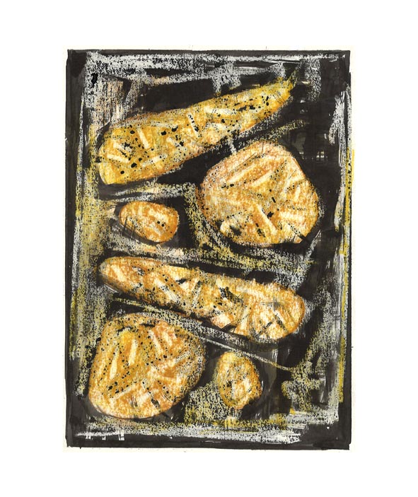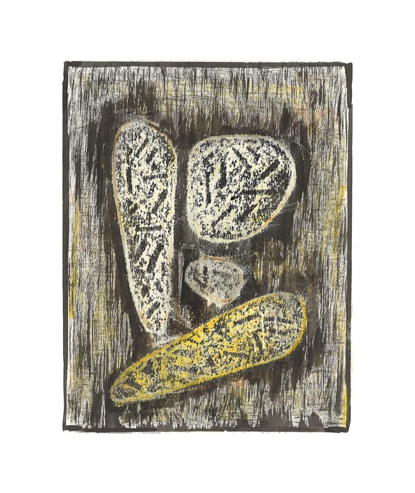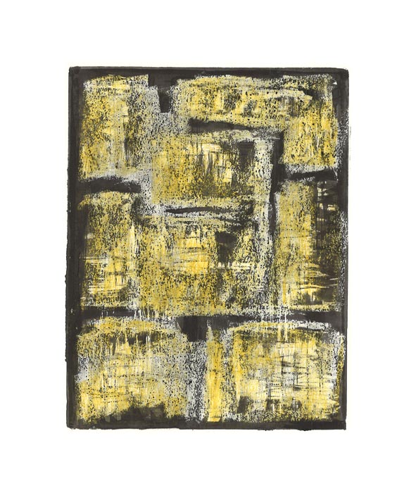 ŽLUTÉ KAMENY 2, ZLATÉ DVEŘE, ŽLUTÉ KAMENY 3 – kresby tuší, voskem a mastným pastelem, různý formát, 2025–2026